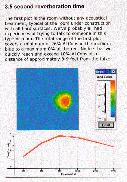 As the sample illustration below shows, it is possible for an acoustic consultant to demonstrate the effect of more or less acoustic treatment within a planned room. The website of McSquared System Design Group provides both graphs and actual sound clips of speech when the reverberation time (and thus the amount of acoustic treatment) is varied for a 40ftx40ftx10ft classroom.